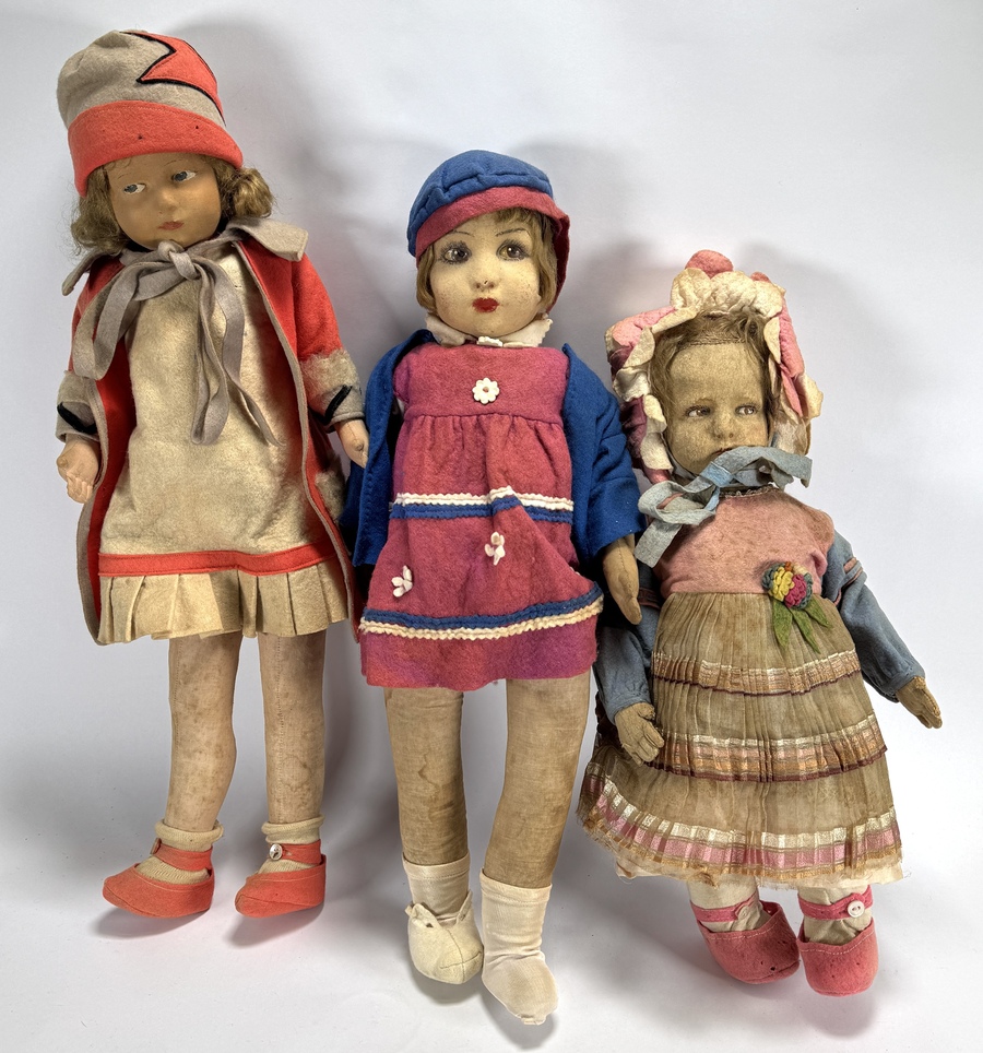 Poppen van Lenci uit de Art Deco periode, vervaardigd uit geperst vilt met handbeschilderde gelaatstrekken. De poppen hebben opzij kijkende ogen en gedetailleerde kostuums met vilten applicaties en geometrische motieven. Daterend circa 1930 en een Italiaanse herkomst.