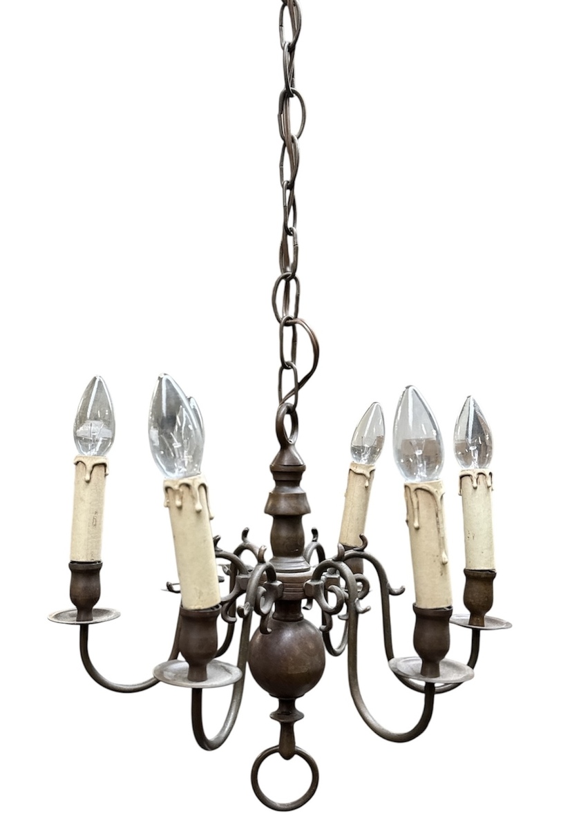 Bolkroon in barokstijl, vervaardigd uit gegoten messing met een balustervormige stam en een geprononceerde bol aan de onderzijde. De zes S-vormige armen zijn voorzien van kaarsenhouders en druipschalen, uitgevoerd met witte kunststof hulzen. De ophanging geschiedt middels een messing schakelketting. De bolkroon dateert uit de 20e eeuw en heeft een Nederlandse herkomst.