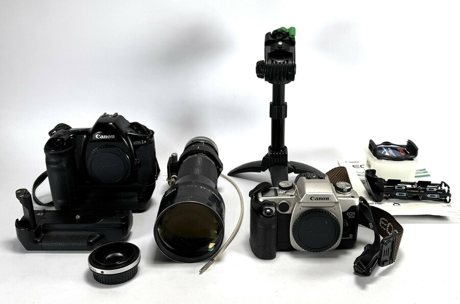 Fotocamera's en toebehoren van Canon waaronder de EOS 10D, EOS 1N en EOS 50E, vervaardigd uit metaal en kunststof. De set bevat tevens een FD 400mm f/4.5 S.S.C. telelens met bijbehorende instructiehandleidingen en accessoires. Merendeel voorzien van de originele fabrieksmerktekens. Datering 1975–2005 en en Japanse herkomst.