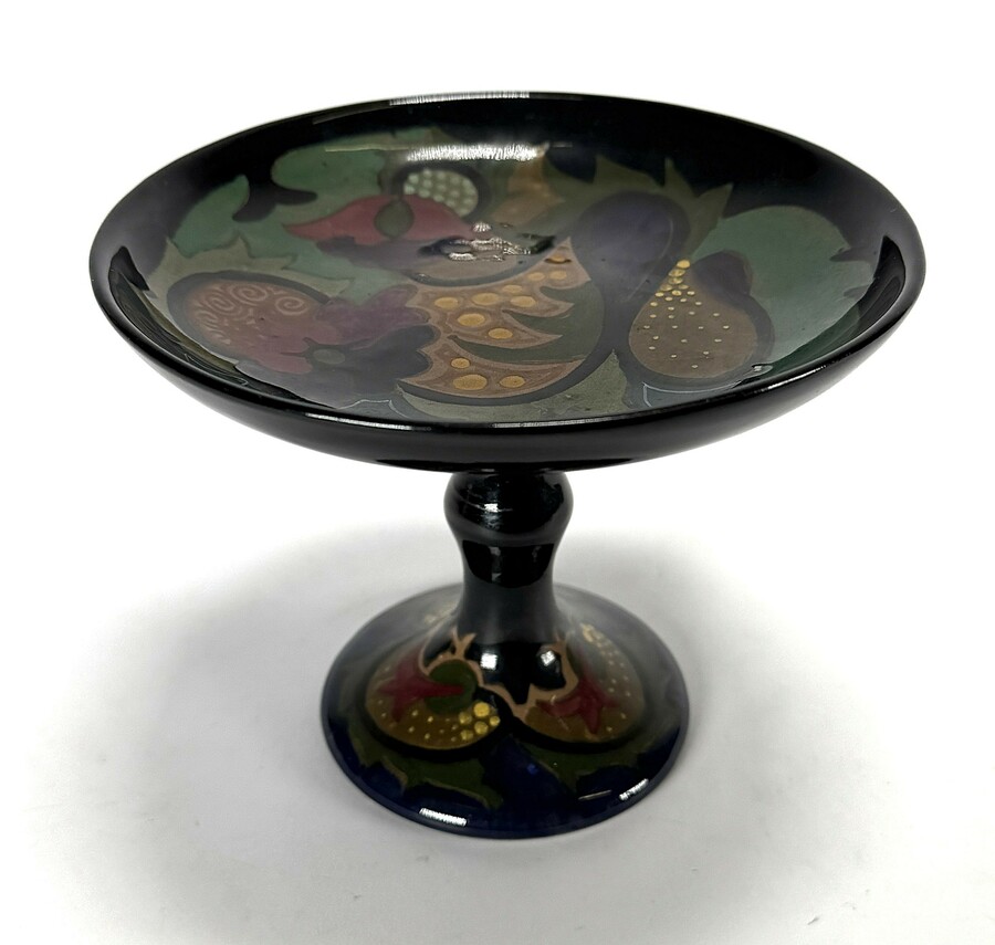 Plateel serveerschaal op voet van Plateelbakkerij Zuid-Holland uit de Art Deco periode, vervaardigd uit handbeschilderd aardewerk. De schaal op hoge balustervormige voet toont een polychroom vruchtendecor tegen een diepzwart hoogglans fond. De onderzijde is gemerkt met het fabriekslogo, modelnummer 754 en schildersinitialen. De serveerschaal dateert uit circa 1925 en heeft een Nederlandse herkomst.