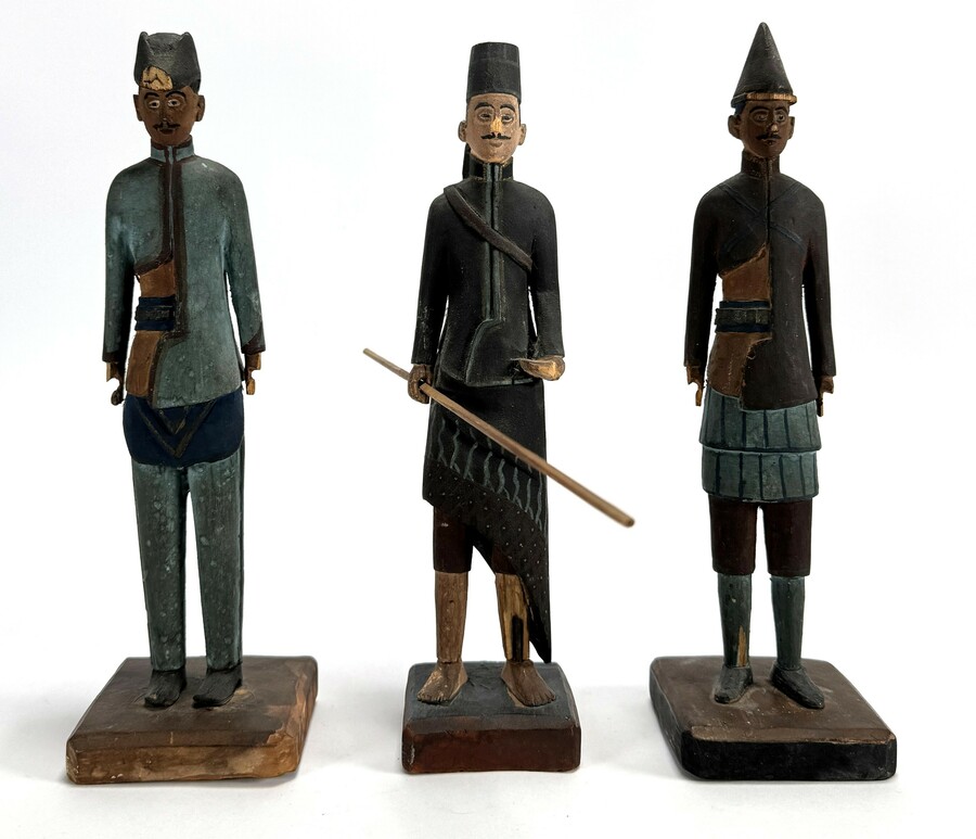 Houten beelden uit de koloniale periode, vervaardigd uit polychroom beschilderd hout met gedetailleerd snijwerk. De kavel bestaat uit een figuur in traditionele Javaanse dracht met batikpatroon en twee figuren in militair uniform. De beelden dateren van omstreeks 1930 en hebben een Indonesische herkomst.