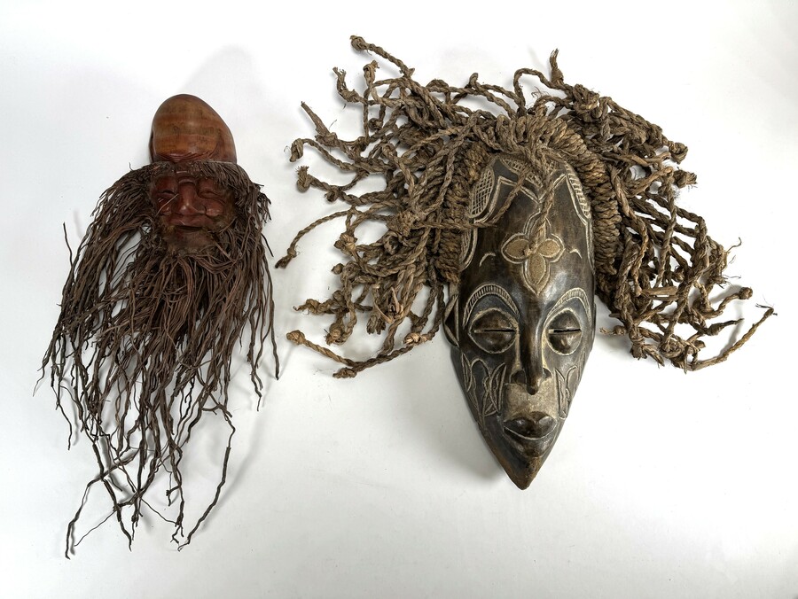 Centraal-Afrikaanse maskers uit de Democratische Republiek Congo, midden 20e eeuw, uitgevoerd in gesneden hout met plantaardige vezels en touw. De kavel bestaat uit een Lega masker met hartvormige contouren en een Songye masker met kaolin inleg en geometrische scarificaties.