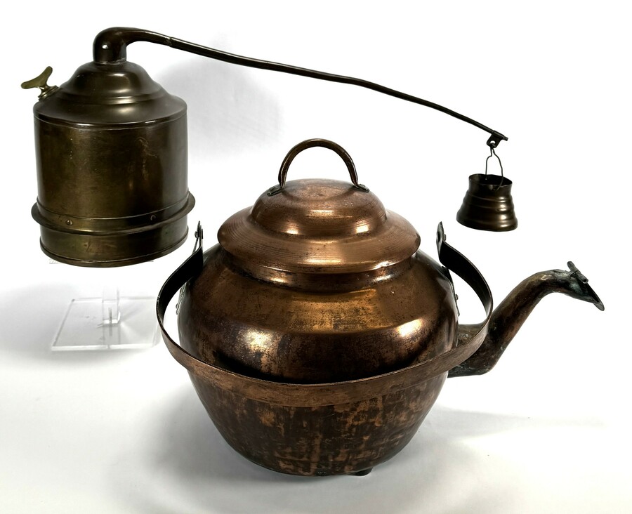 Messing kroepketel vervaardigd voor medicinale stoombehandeling en een koperen ketel. Daterend rond 1900 en een Europese herkomst.