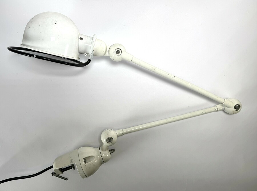 Klemlamp van Jean-Louis Domecq (1920–1983), model "Signal SI332" uit de Mid-century modern periode, vervaardigd uit wit gelakt staal en aluminium. De lamp heeft twee verstelbare armen en een schroefklem met spindelmechanisme. Gemerkt met de originele sticker van Jieldé. De klemlamp dateert uit circa 1955 en heeft een Franse herkomst.