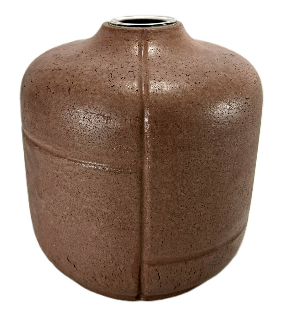 Vaas van Rita Koralevics uit de Paper Up! Collection, vervaardigd uit een composiet van papierpulp gemengd met cement. Het ontwerp toont een bruine textuur met een geometrisch reliëf dat de wand in segmenten verdeelt. Voorzien van een glazen binnen vaas. Deze vaas dateert van ca. 2018 en heeft een Hongaarse herkomst.