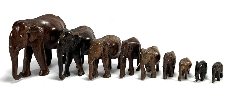 Negen olifanten vervaardigd uit hardhout met handgesneden en gepolijste afwerking. De negen exemplaren variëren in formaat en houtsoort, waaronder donker gebeitste figuren en lichter generfde varianten; enkele hebben slagtanden van been. De olifanten dateren uit midden 20e eeuw en hebben een herkomst in Afrika.