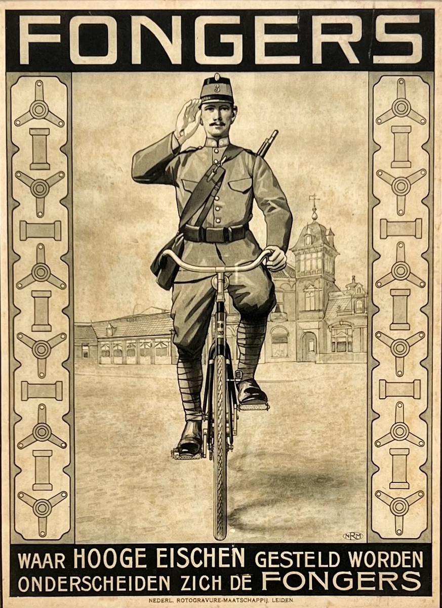 Affiche van Fongers, uit de vroeg-modernistische periode, vervaardigd uit papier met druktechniek in zwart-beige tinten. Te zien zijn een saluerende militair op een rijwiel, fabrieksbebouwing op de achtergrond en repeterende zijpanelen met gestileerde fietsonderdelen, met de tekst "waar hooge eischen gesteld worden, onderscheiden zich de Fongers". Onderaan gedrukt Nederl. Rotogravure-Maatschappij, Leiden, met NRM-monogram rechtsonder. De affiche dateert uit ca. 1920 en heeft een Nederlandse herkomst.