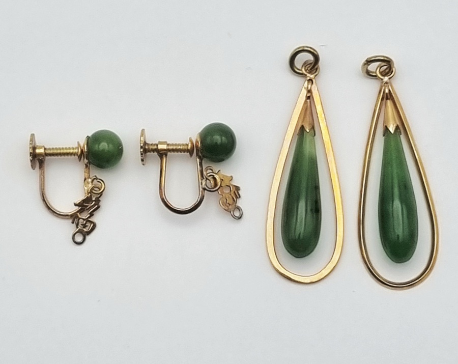 Gouden 14-karaats oorbellen bestaande uit twee paren, gemerkt 585, met nefriet. De kavel bevat een paar schroefoorknoppen met groene stenen en goudkleurige karakters en een paar hangers met druppelvormige elementen in een open omlijsting. De oorbellen zijn vervaardigd in de periode 1940–1950.