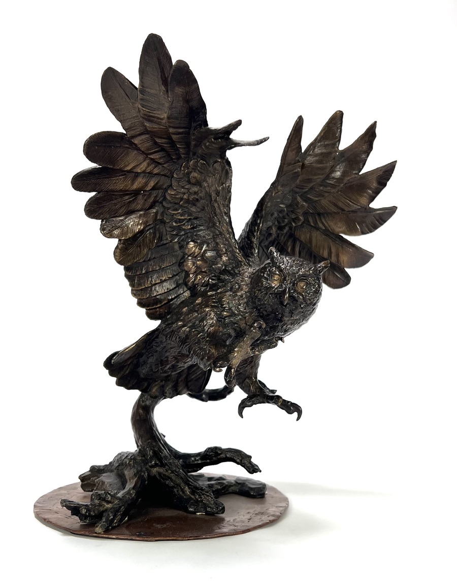Beeld in de vorm van een jagende uil, vervaardigd uit brons met een donkerbruine patinering. Het beeld toont de vogel in een dynamische houding met gespreide vleugels, landend op een boomstronk, met verfijnde verentextuur en de realistische anatomie. Het beeld dateert uit de late 20e eeuw en is voorzien van een monogram op de organisch gevormde basis.