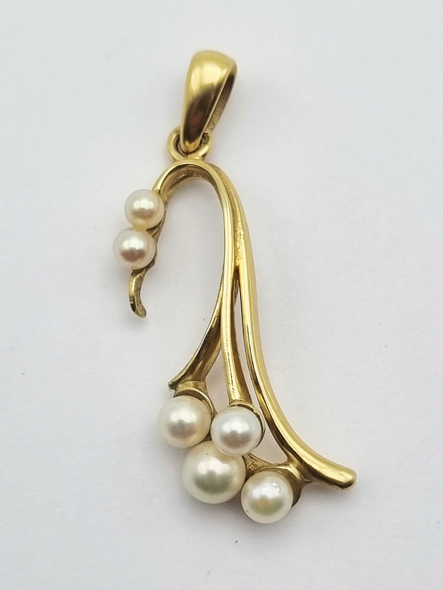 Gouden 14-karaats hanger uitgevoerd in een organische vormgeving, bezet met zes witte cultivé parels van uiteenlopende grootte. De vloeiende lijnen van het geelgouden montuur monden uit in gestileerde takken waaraan de parels zijn bevestigd. De hanger is gemerkt met eikenblad op het oog, datering omstreeks 1970.