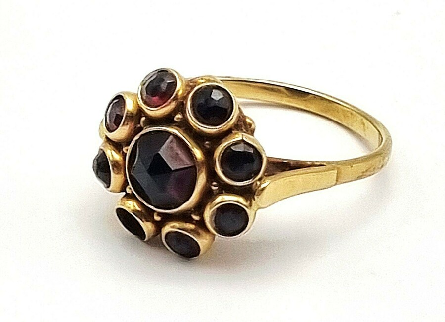 Ring uit de Victoriaanse periode, vervaardigd uit 14 karaat getoetst goud met gesloten zetting en bezelgezette granaten. De ring heeft een verhoogde bloemrozet met een grotere centrale granaat, omgeven door acht kleinere ronde stenen in een opengewerkte galerij. De ring dateert uit het laatste kwart van de 19e eeuw en heeft een vermoedelijk Boheemse of Midden-Europese herkomst.
