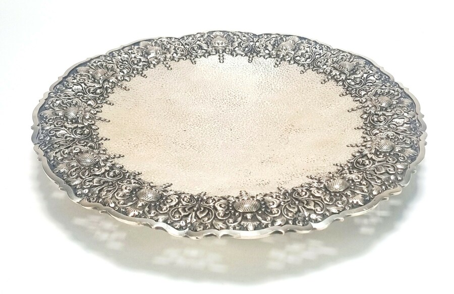 Schaal van uit de koloniale periode, circa 1930, vervaardigd uit 800/1000 Djokja zilver. De ronde schaal toont een decoratie van tropische vruchten en florale motieven langs de geschulpte rand. Het centrum is voorzien van een fijn gehamerd fond. De onderzijde is gemerkt met het meesterteken AD en het gehalte 800. De schaal heeft een herkomst in Java, Nederlands-Indië.