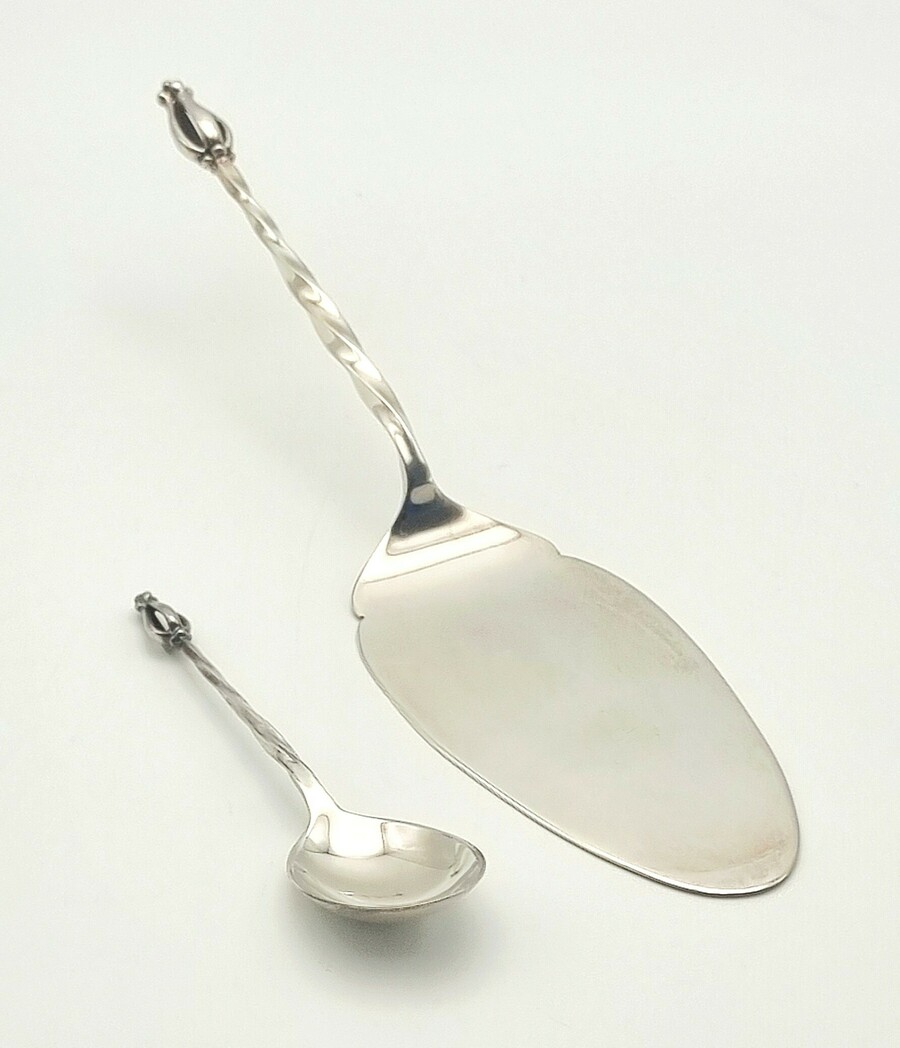 Bestek van Koninklijke Van Kempen & Begeer, vervaardigd uit 835/1000 zilver. De set omvat een taartschep en suikerschep met getordeerde stelen en gestileerde bekroningen. Gemerkt met het Nederlandse zwaardje en meesterteken, Nederlandse herkomst.