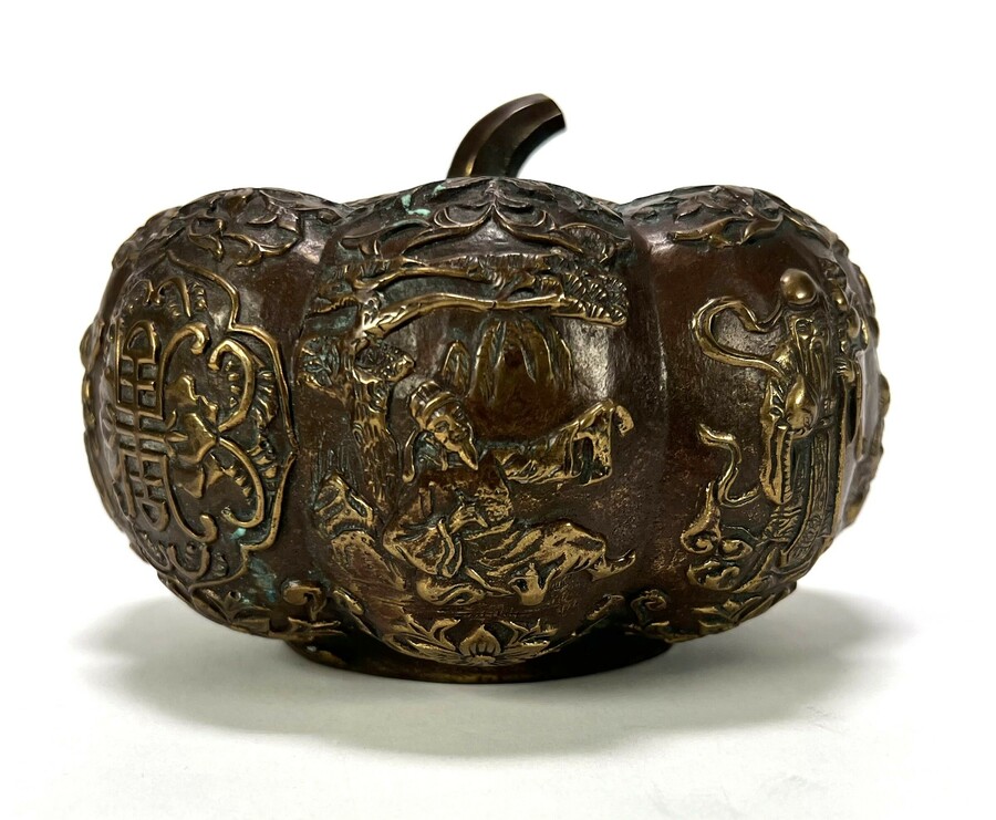 Dekseldoos uit de Qing periode, vervaardigd uit brons met gegoten en geciseleerde decoratie. Het pompoenvormige lichaam bestaat uit gelobde segmenten met rondom reliëfpanelen waarin figuren, gelukssymbolen en florale rankmotieven zijn uitgewerkt. Het deksel heeft een gebogen steelvormige knop. De dekseldoos dateert uit circa 1900 en heeft een herkomst in China.