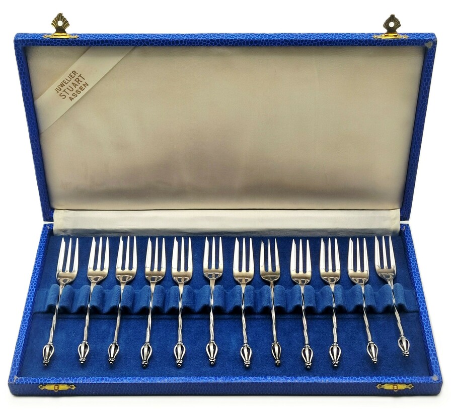 Bestek van Koninklijke Van Kempen en Begeer vervaardigd uit zilver (835/1000). De twaalf gebaksvorkjes vertonen getordeerde stelen die uitmonden in ajour bewerkte druppelvormige bekroningen. Gemerkt met het zwaardje en het meesterteken van de zilverfabriek. Het bestek dateert uit de jaren '60 en heeft een Nederlandse herkomst, geleverd in blauwe presentatiecassette van juwelier Stuart, Assen.