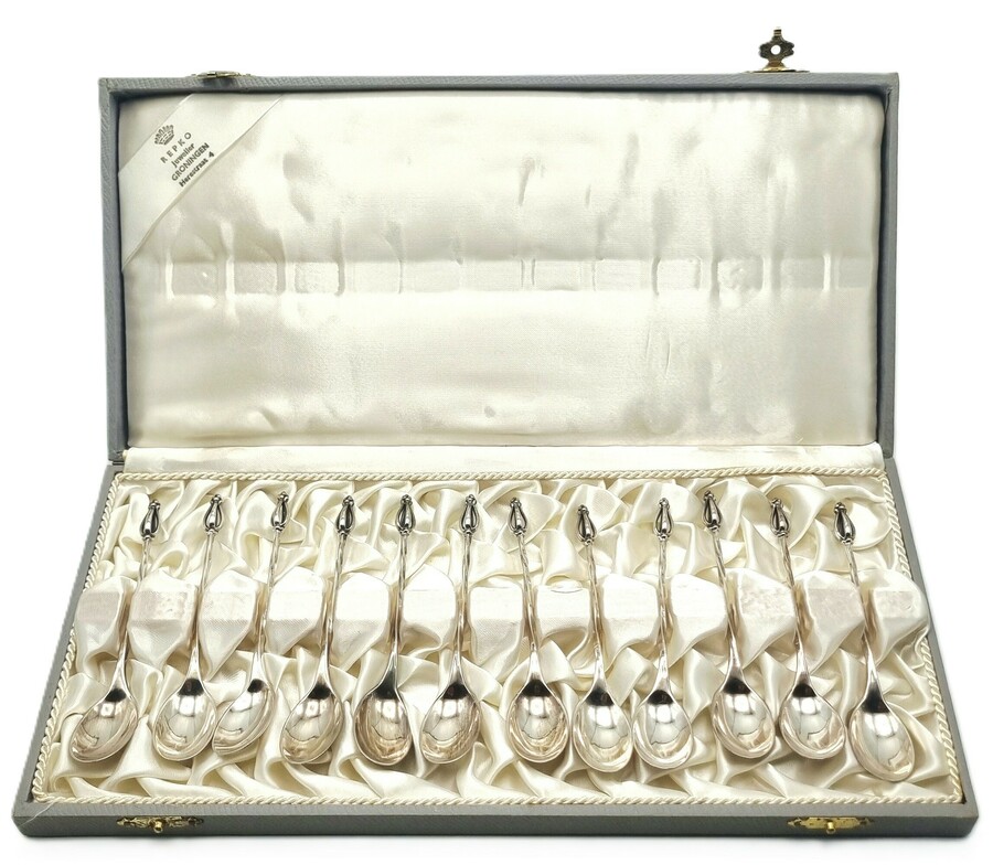 Bestek van Koninklijke Van Kempen & Begeer, omstreeks 1960, vervaardigd uit zilver (835/1000). De 12-delige set theelepels toont getordeerde stelen en gestileerde bekroningen. Gemerkt met het Nederlandse zwaardje en het meesterteken van de zilverfabriek. De set is gepresenteerd in de cassette van Juwelier Repko te Groningen. Herkomst Nederland.