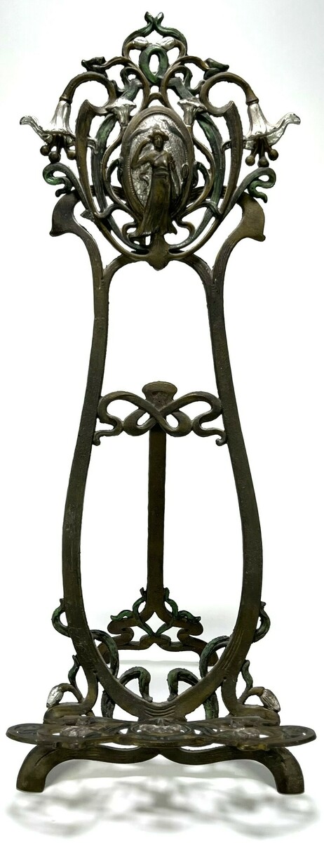 Art Nouveau schildersezel vervaardigd uit gietijzer met ajour gegoten ornamentiek. Het frame toont florale krullen en kelkvormige bloemen rond een ovaal reliëfmedaillon met vrouwelijke figuur. De schildersezel dateert uit circa 1900 en heeft een herkomst in West-Europa.