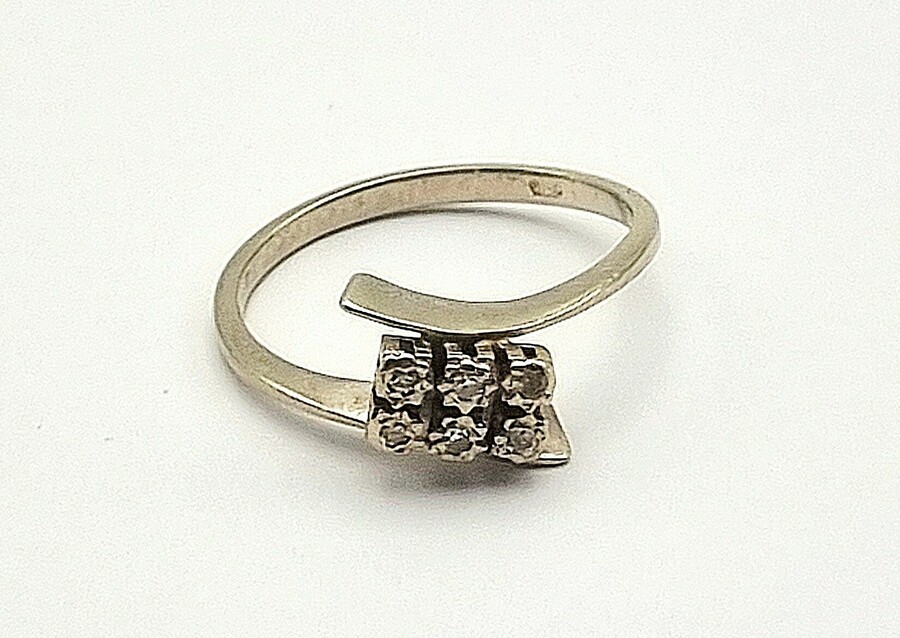 Gouden 18-karaats ring met zes briljant geslepen diamanten uitgevoerd in witgoud, gemerkt 750. De ring toont een zetting waarbij de briljanten in twee parallelle rijen zijn geplaatst tussen de vloeiende uiteinden van de band. Datering midden 20e eeuw.
