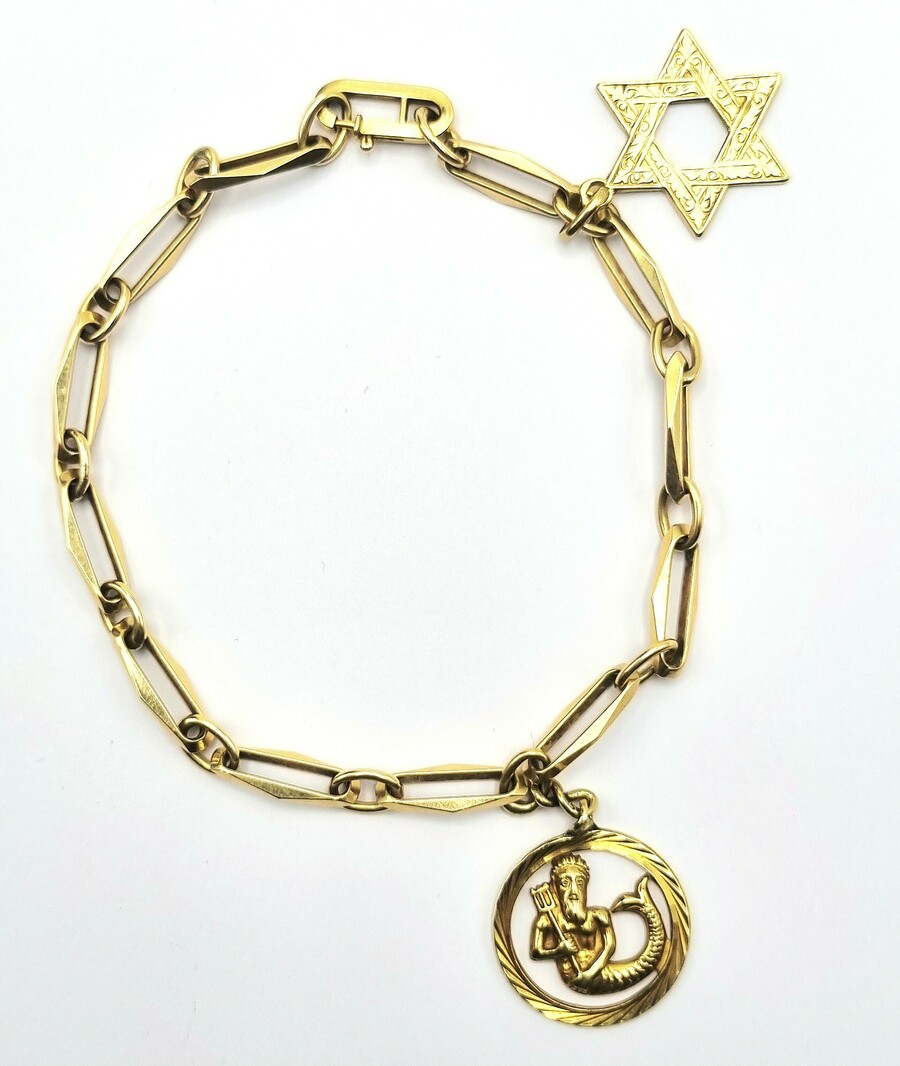 Gouden 14-karaats armband uitgevoerd met open schakels, voorzien van twee symbolische hangers; een zeskantige davidster met fijn graveerwerk en een ronde hanger gedecoreerd met een Neptunus. Beide hangers gemerkt 14 karaat, eikenblad en 585, de armband is gemerkt met 585. Datering tweede helft 20e eeuw.