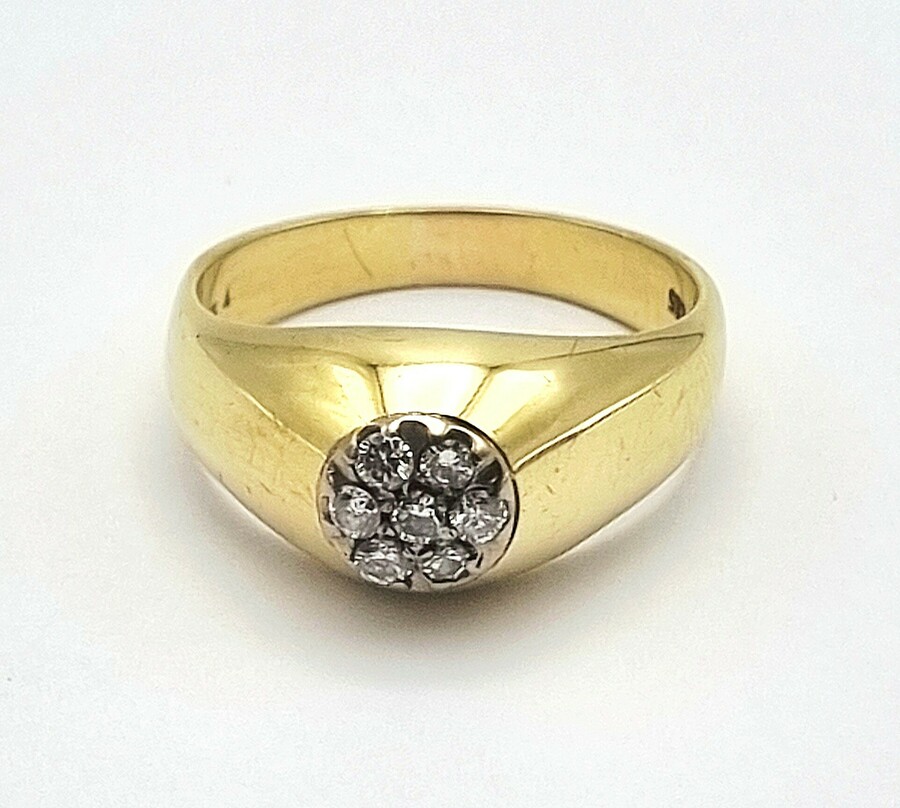 Gouden 14-karaats ring, gemerkt 585, centraal bezet met zeven diamanten. De diamanten zijn in een gouden zetting geplaatst, rustend op een robuuste geelgouden scheen. Datering midden 20e eeuw.
