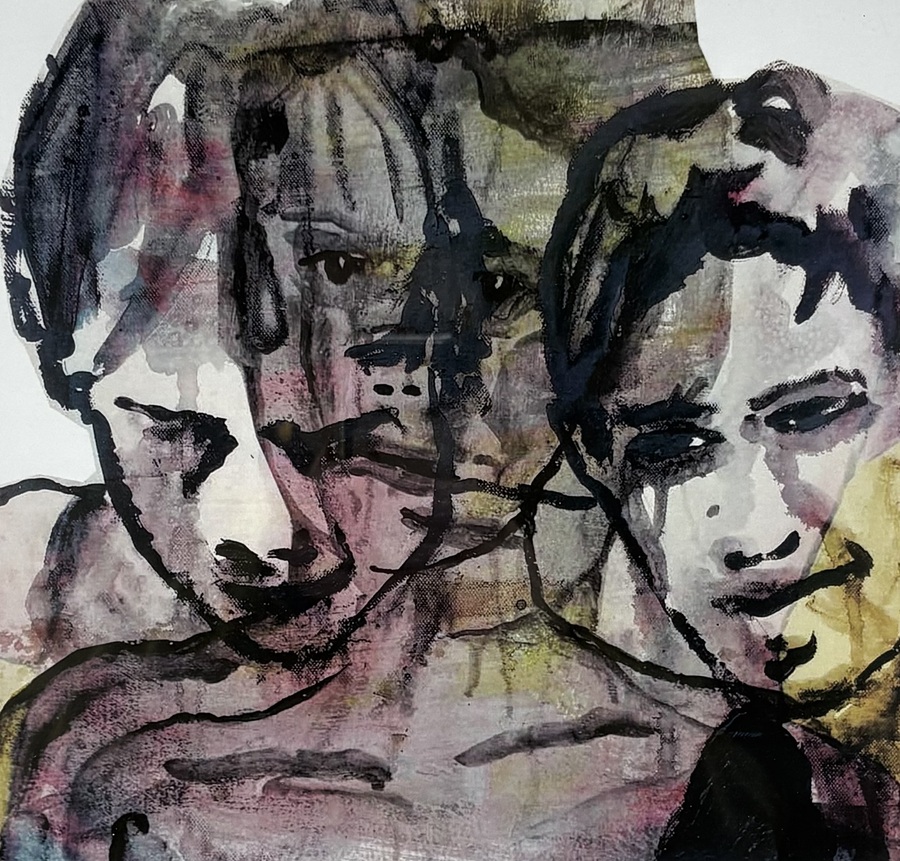 Zeefdruk op papier door A Broken Universe (Ecuadoraanse kunstenaar, gevestigd in Nederland) toont drie gelaagde portretten in expressionistische stijl. De compositie combineert transparante kleurvlakken in aubergine en grijs met zwarte contourlijnen. Linksonder genummerd 11/x, in het midden gesigneerd en rechtsonder gedateerd 2016.