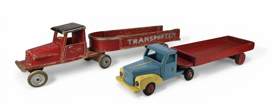 Twee houten vrachtauto's waarvan een gemerkt Efro, vervaardigd uit handgeschilderd hout. Het rode exemplaar van Thedo Culemborg heeft een oplegger met het opschrift "Transporten", de blauwe vrachtwagen is voorzien van het Efro merketiket. De vrachtwagens dateren uit circa 1935–1955.