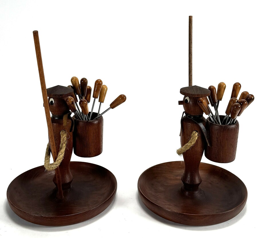 Cocktailprikkers met houders vervaardigd uit gepolijst hout met metalen prikkers voorzien van houten knopjes. De houders zijn figuren met touwdetails en een korf op de rug waarin de vorkjes rusten. Daterend uit circa 1960 en heeft een Noord-Europese herkomst.