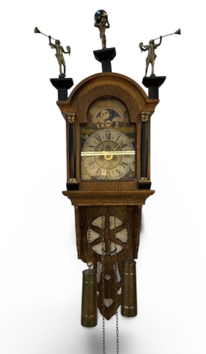 Friese staartklok, schippertje, uitgevoerd met eikenhouten kast voorzien van opengewerkte zijvensters. Het uurwerk met kettingophanging drijft een handbeschilderde wijzerplaat aan, gedecoreerd met een maanfase en bloemmotieven in de hoeken. De kap wordt bekroond door metalen figuren Atlas en bazuinblazers. Voorzien van messing slinger en gewichten, datering circa 1970.