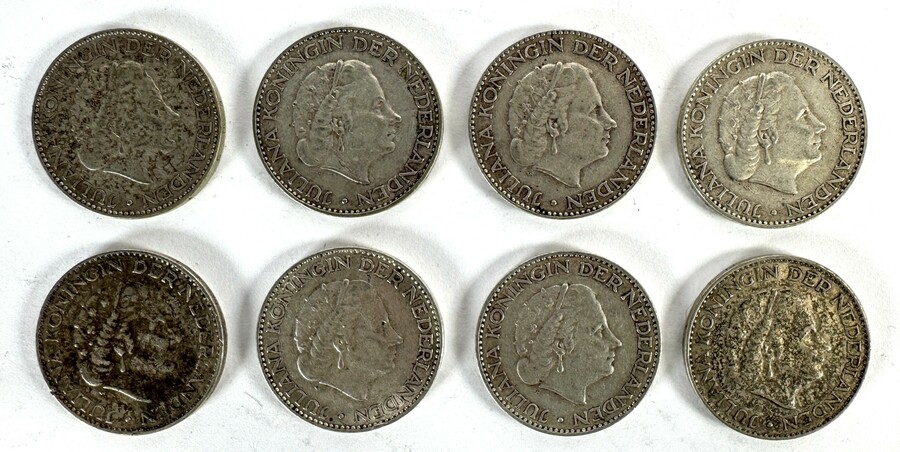 Zilveren munten van 1 gulden uit de periode 1954–1958, vervaardigd uit 720/1000 zilver. De set van acht stuks toont het naar rechts gewende portret van Koningin Juliana en het gekroonde Nederlandse rijkswapen tussen de waarde aanduiding. Geslagen bij 's Rijks Munt te Utrecht met diverse muntmeestertekens.