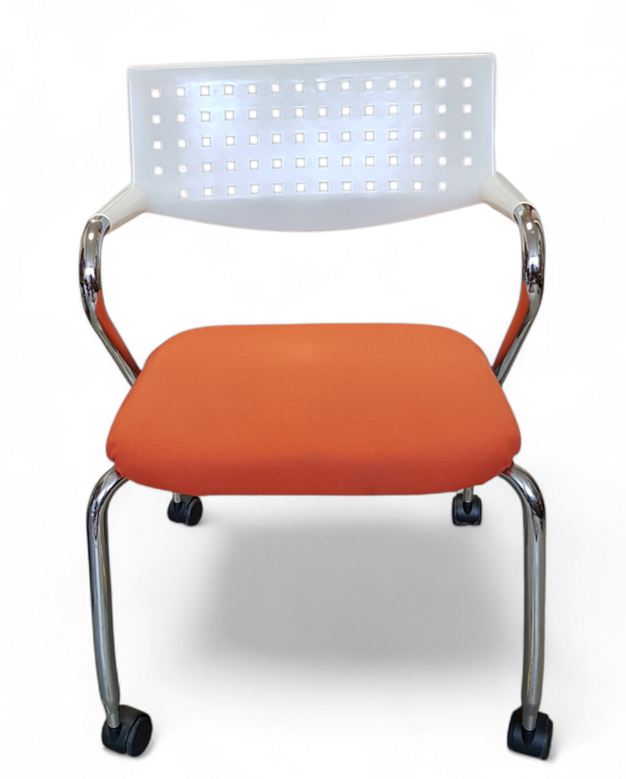Stoel van Vitra naar ontwerp van Antonio Citterio, uitgevoerd als model Visaroll 2 in hedendaagse stijl. De stoel is vervaardigd uit een verchroomd aluminium frame met een geperforeerde kunststof rugleuning en een oranje gestoffeerde zitting. Het ontwerp is voorzien van zwenkwielen. De stoel dateert van circa 2005 en heeft een Europese herkomst.