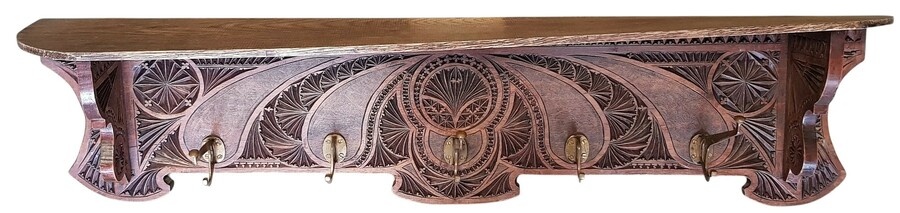 Kapstok uit de Art Deco periode, vervaardigd uit eikenhout met traditionele Friese kerfsnede. De kapstok toont rozetmotieven en gestileerde ornamentiek en is uitgevoerd met vijf messing haken en een hoedenplank. De kapstok dateert uit de eerste helft van de 20e eeuw en heeft een Nederlandse herkomst.