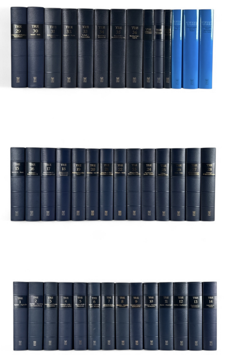 Boeken van uitgeverij Walter de Gruyter, omvattende de volledige Duitstalige reeks Theologische Realenzyklopädie in 36 delen. De wetenschappelijke editie is uitgevoerd in halflinnen banden en bevat naast de hoofdteksten diverse registers en samenvattingen. De encyclopedie geldt als een standaardwerk binnen de theologie en godsdienstwetenschappen. De reeks dateert uit de periode 1977–2004 en heeft een Duitse herkomst.