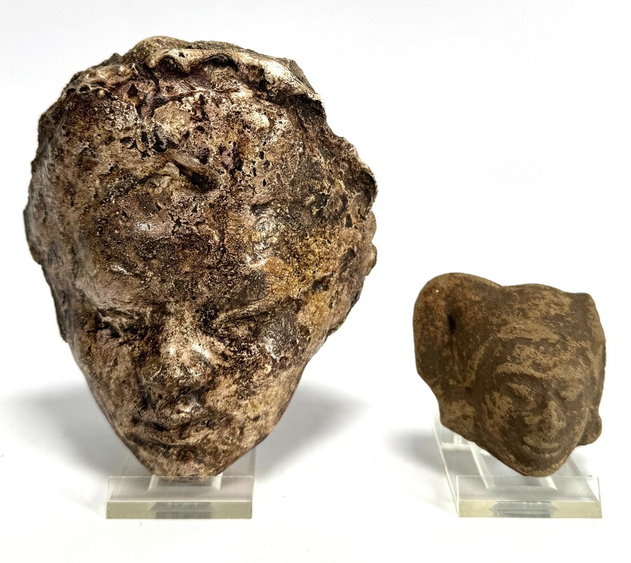 Beeldjes in archaïsche stijl, vervaardigd uit aardewerk met hand geboetseerde gelaatstrekken. De beelden tonen gefragmenteerde menselijke hoofden met een verweerd oppervlak en grove textuur. De sculpturale vormen hebben een etnografisch karakter. Datering circa 1900.