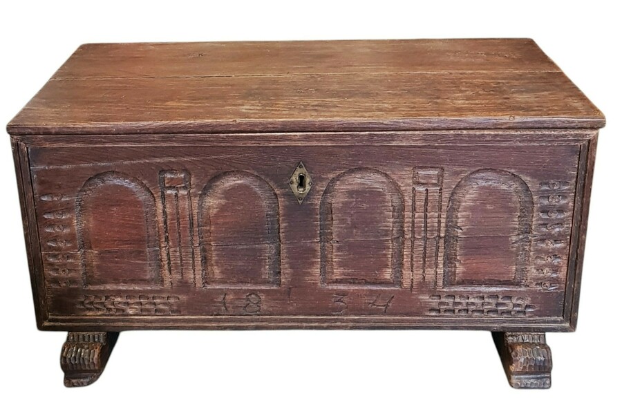 Kist uit de biedermeier periode, vervaardigd uit eikenhout met ambachtelijk gestoken panelen en smeedijzeren beslag. De voorzijde toont vier getoogde blindnissen, geflankeerd door gestileerde pilasters op robuuste houten sleden. De kist heeft zware smeedijzeren grepen en scharnieren. De kist dateert uit 1834 en heeft een Noord-Europese herkomst.