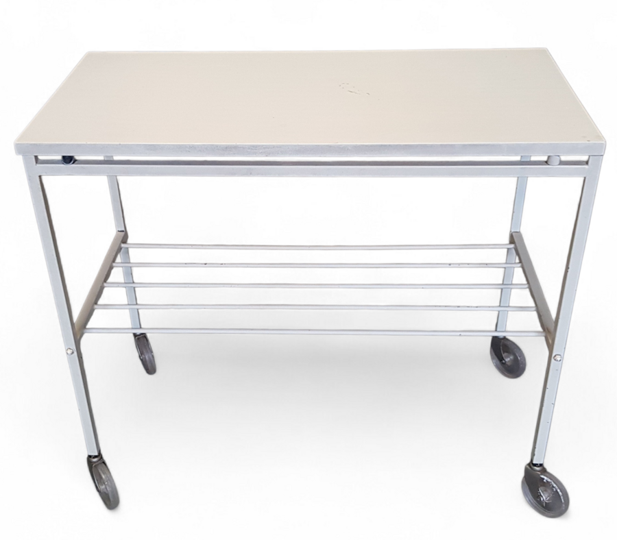 Bijzettafel vervaardigd uit een grijs gelakt ijzeren onderstel met een wit houten blad. De verrijdbare tafel is uitgevoerd met twee niveaus, waarbij het onderste gedeelte is voorzien van een metalen rek. De strakke vormgeving en functionele zwenkwielen zijn typerend voor industrieel design rond 1960, een Europese herkomst.