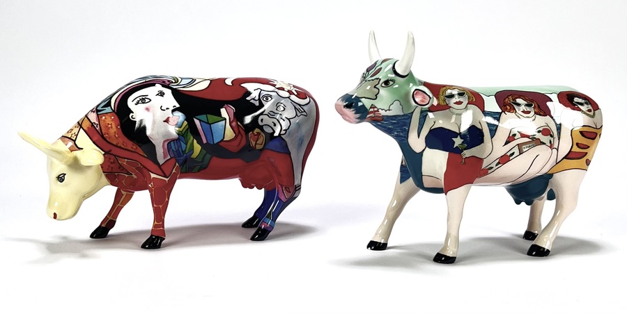 Beeldjes van CowParade uit de hedendaagse periode, 2005, vervaardigd uit polychroom geglazuurd keramiek. De kavel omvat de medium modellen 'Picasso Art', een eerbetoon aan de Afrikaanse periode van de kunstenaar, en 'Fun Seeker' met zomerse strandtaferelen. Gemerkt aan de onderzijden met CowParade Holdings Corporation, Westland Giftware, modelnummers en datering 2005.