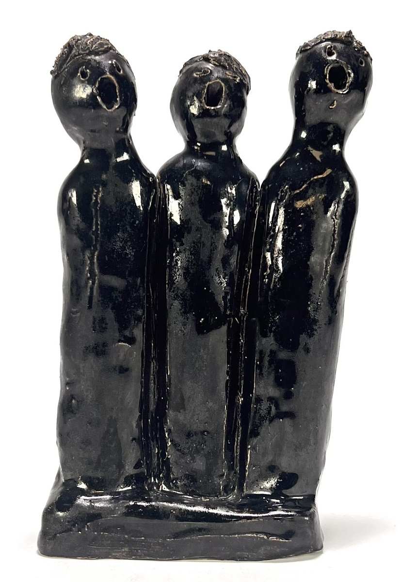 Beeld in expressionistische stijl, vervaardigd uit keramiek met donker glanzend glazuur. De drie zingende figuren hebben cilindrische lichamen, open monden, ruw gemodelleerde haarpartijen en asymmetrisch gekantelde hoofden op een rechthoekige basis. Een monogram aan de onderzijde is zichtbaar. Het beeld dateert uit de tweede helft van de 20e eeuw en heeft een Europese herkomst.
