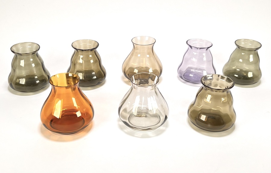 Vaasjes vervaardigd uit mondgeblazen glas in diverse kleurnuances. De verzameling toont een variëteit aan organische vormen, waaronder taps toelopende en buikige modellen in amberkleurig, paars en grijs rookglas. De vaasjes dateren uit circa 1970 en hebben een Europese herkomst.