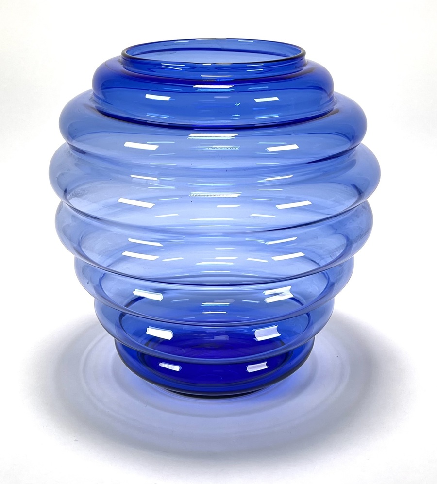 Vaas in postmoderne stijl, vervaardigd uit blauw glas met geblazen optische ribben. De bolronde wand is opgebouwd uit brede horizontale geledingen, oplopend naar een korte cilindrische hals met afgeslepen rand en een zwaar ingetrokken bodempartij. Datering eind 20e eeuw.
