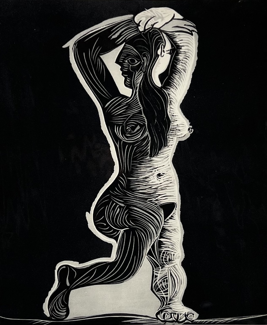 Prent van Pablo Picasso (1881–1973) toont een vrouwelijke naaktfiguur getiteld "Grand nu de Femme" in modernistische stijl, uitgevoerd in heliogravure op papier. De heliogravure is gebaseerd op een linosnede uit 1966. Uitgegeven door S.P.A.D.E.M. en Cosmopress Genève. De prent dateert uit het laatste kwart 20e eeuw, Franse herkomst.