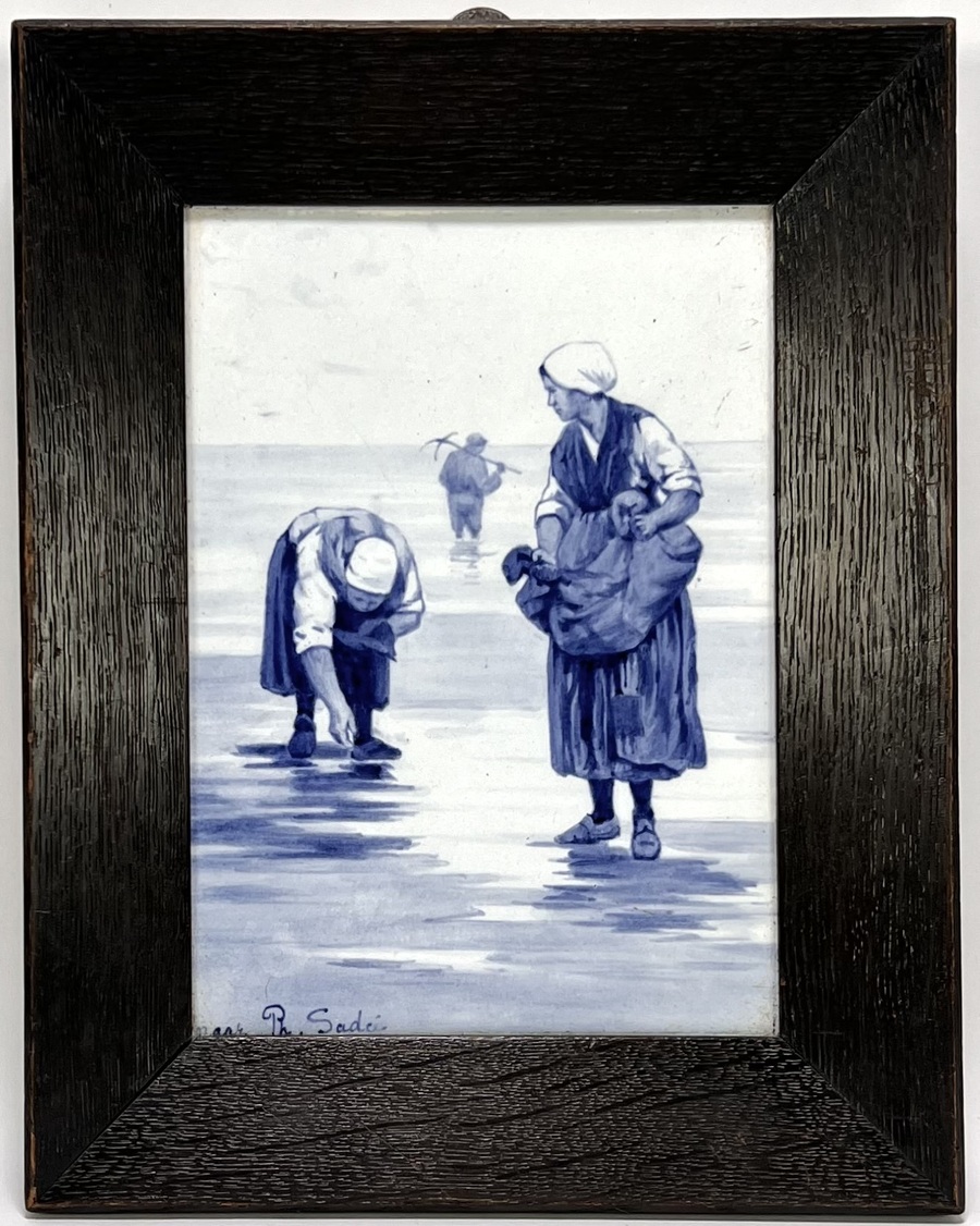 Ingelijste tegel van De Porceleyne Fles naar Philip Sadée uit de Haagse School periode, vervaardigd uit aardewerk met Delfts blauwe handbeschildering. De voorstelling toont vissersvrouwen tijdens de arbeid op het strand. Linksonder bevindt zich de signatuur naar Sadée, terwijl de achterzijde het fabrieksstempel van Joost Thooft & Labouchere draagt. De tegel dateert uit circa 1890 en heeft een Nederlandse herkomst.
