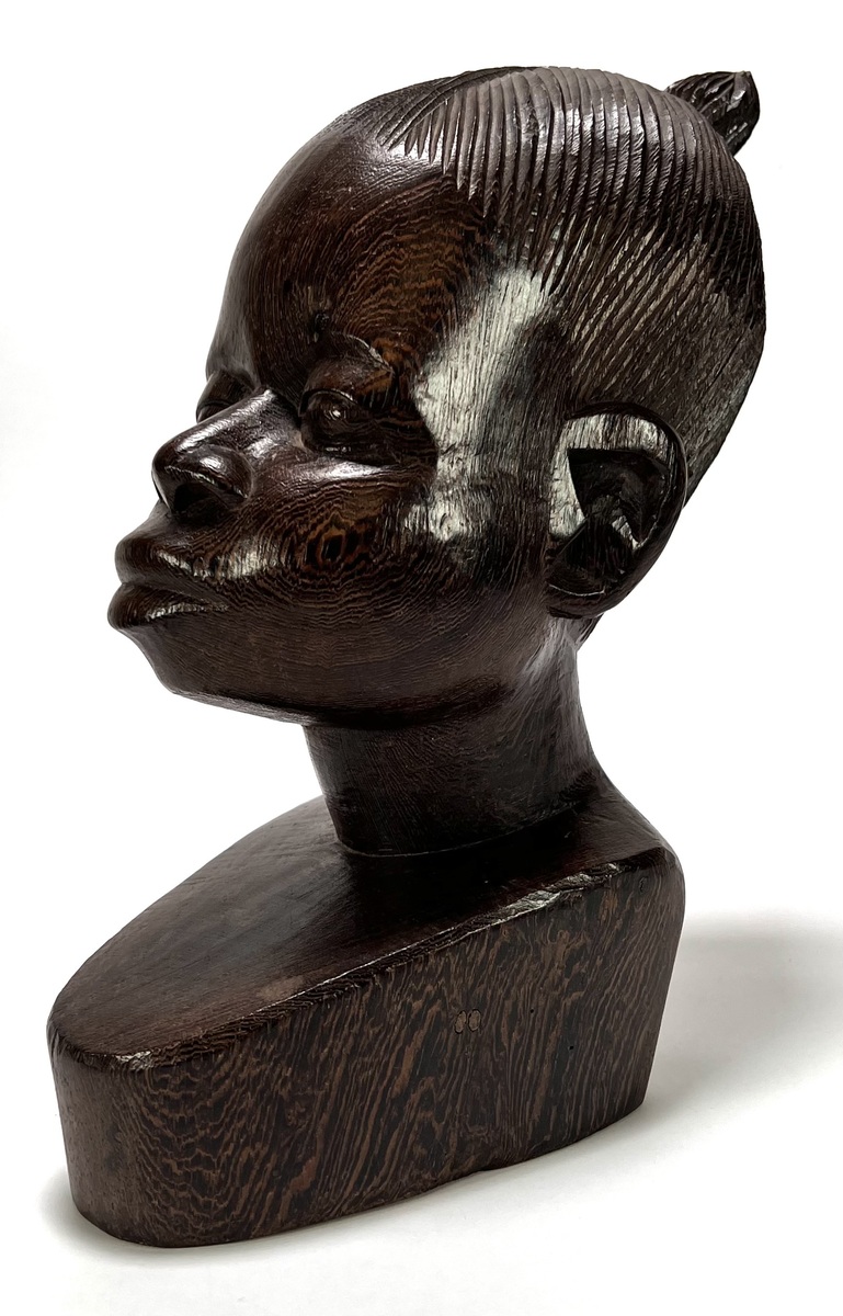 Makonde Mawingu beeld uit Tanzania, late 20e eeuw, handgesneden uit donker gepolijst hardhout. Het borstbeeld van een vrouwelijke figuur toont naturalistische gelaatstrekken met opgestoken haar.