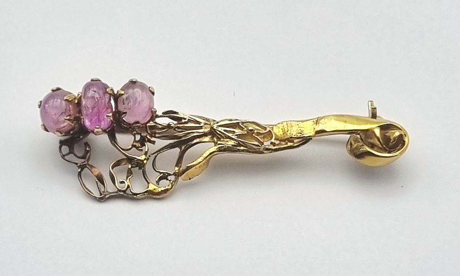 Broche uit de Art Nouveau periode, vervaardigd uit getoetst 21-karaats geelgoud met ajour uitgevoerd goudwerk en drie cabochon geslepen sterrobijnen in klauwzettingen. De broche toont een opengewerkte rank met bladornament en een compacte tros van sterrobijnen De broche dateert uit circa 1900–1910.
