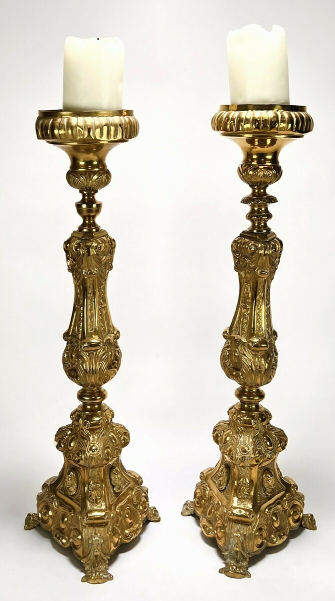 Kerkkandelaren uit de neobarok periode, circa 1870, vervaardigd uit messing met gietwerk. De driezijdige voetstukken tonen gedetailleerde reliëfs met hoofden van heiligen en florale volutes, rustend op karakteristieke klauwpootjes. De rijk gedecoreerde balusterschachten ondersteunen geprofileerde vethangers met parelranden. De kandelaren dateren uit de negentiende eeuw en hebben een herkomst in Noord-Europa.