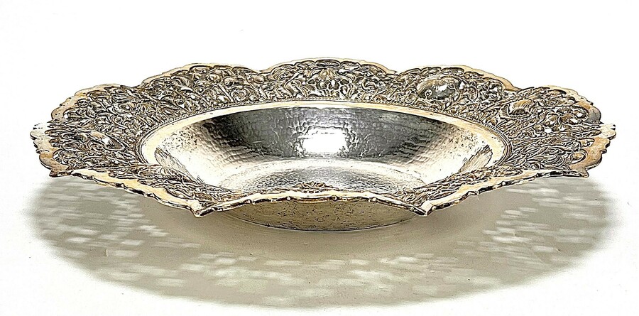 Djokja zilveren schaal met 800 merk, uit de eerste helft van de 20e eeuw. De brede ajourrand is dicht uitgewerkt met lotusbloemen en bladvoluten, afgewisseld met schelpmotieven, terwijl het midden een gehamerde spiegel toont. In vorm en ornament sluit de schaal aan bij Javaans koloniale zilversmeedkunst uit Yogyakarta, uitgevoerd in gedreven en geciseleerd werk.