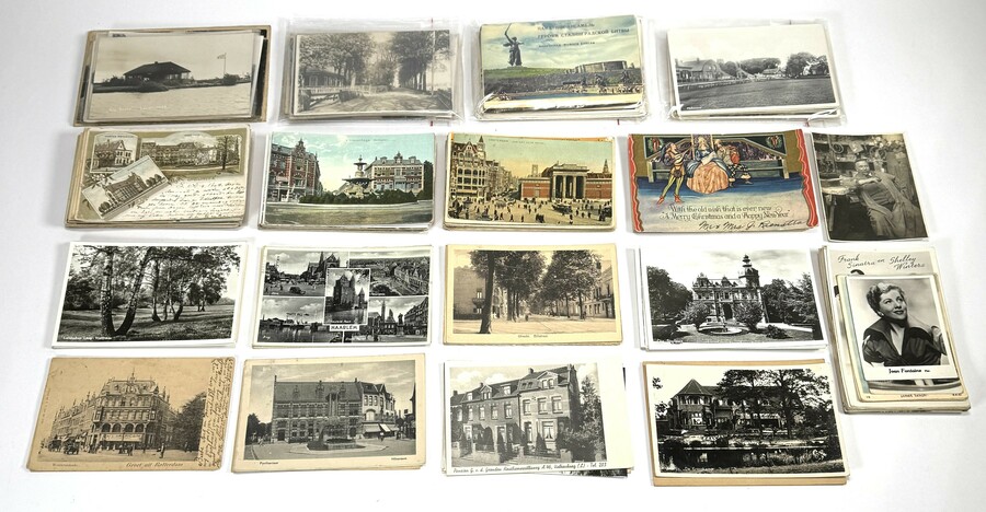 Verzameling van circa 175 vintage ansichtkaarten, bestaande uit topografische stadsgezichten van Groningen (39x), Den Haag (29x), Rotterdam (3x), Amsterdam (24x), Wolfheze (11x), Hilversum (4x), Haarlem (5x), Valkenburg (4x), Utrecht (8x), Heerde (4x), Baarn (9x), naast portretten van Amerikaanse filmsterren (25x) en varia. De collectie toont diverse druktechnieken zoals chromolithografie en vroege zilvergelatinedrukken op karton. Daterend uit de periode 1890–1960 en een hoofdzakelijk Nederlandse en Amerikaanse herkomst.