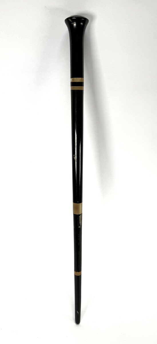 Wijsstok, vervaardigd uit zwartgelakt hout met ingelegde messing banden. Het langgerekte taps toelopende lichaam eindigt in een bolvormige knop en aan de andere zijde in een uitstaande monding. De wijsstok dateert uit het begin van de 20e eeuw en heeft een West-Europese herkomst.