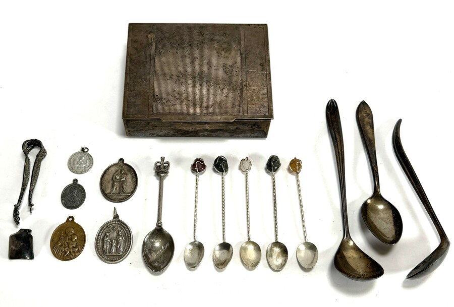 Kistje met onder andere gegraveerde souvenirlepels met bekroningen, diverse religieuze medailles en een suikertang met klauwpoten. Datering 19e/vroege 20e eeuw en een Nederlandse herkomst.