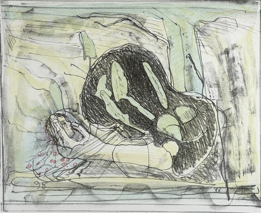 Litho door Co Westerik (1924–2018), in kleur op papier, toont een compositie met een hand en hoofd, opgebouwd uit contourlijnen, grijze schaduwpartijen en bleekgroene vlakken. Midden onder gesigneerd en gedateerd 1995; oplage 16/50. Herkomst Nederland.