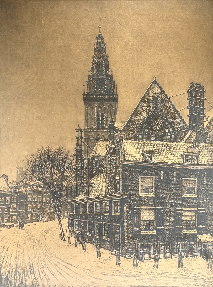 Ets door Cornelis Brandenburg (1884–1954) toont het Oudekerksplein te Amsterdam in een winters tafereel, uitgevoerd in etstechniek op papier. Rechtsonder gesigneerd en linksonder getiteld in potlood. De ets heeft een Nederlandse herkomst en dateert uit circa 1920.